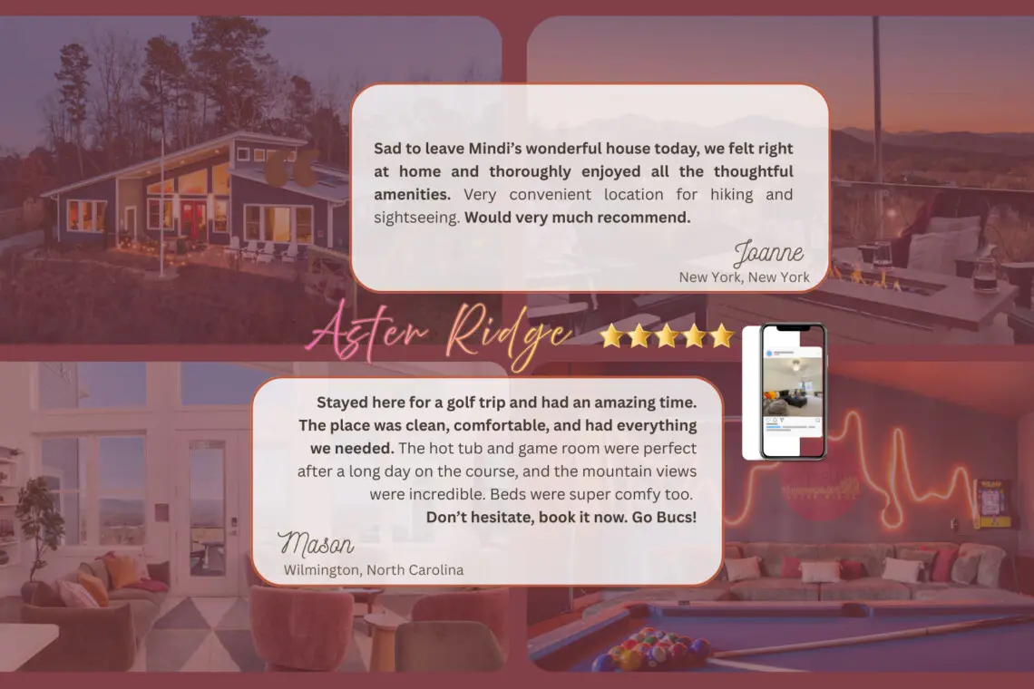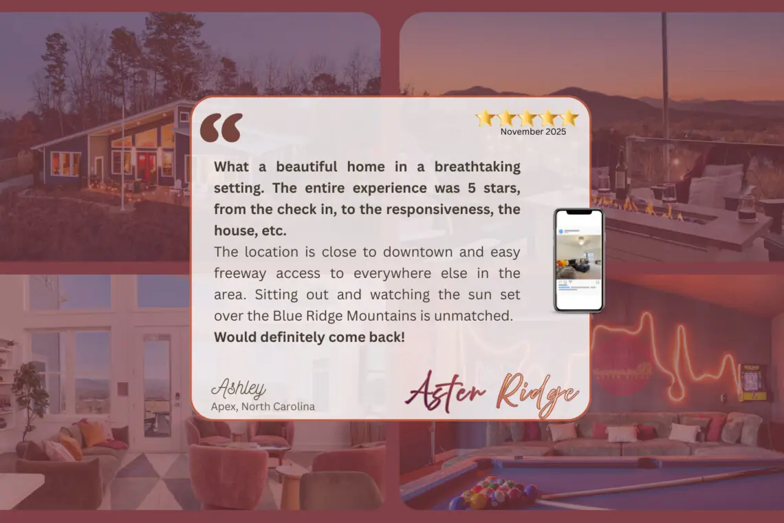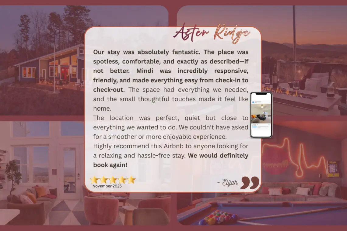 Aster Ridge is designed for families, offering spacious living areas and plenty of entertainment for all ages, including shuffleboard, Pac-Man, and a movie room. The natural surroundings provide a safe space for outdoor fun, while the two dining areas and fully equipped kitchen make mealtime easy. Extras like bath robes and board games ensure everyone feels at home.