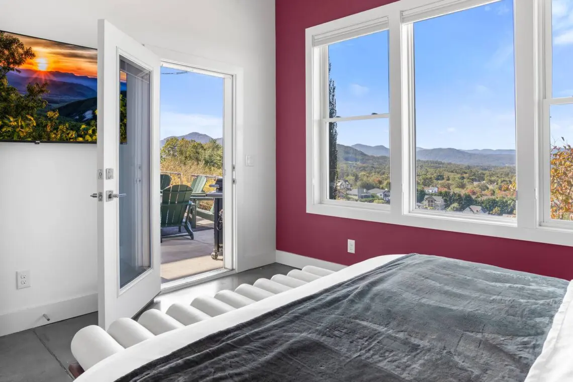 *BEDROOM 2: King bed, deck access, mountain views, and smart Roku TV and fan.