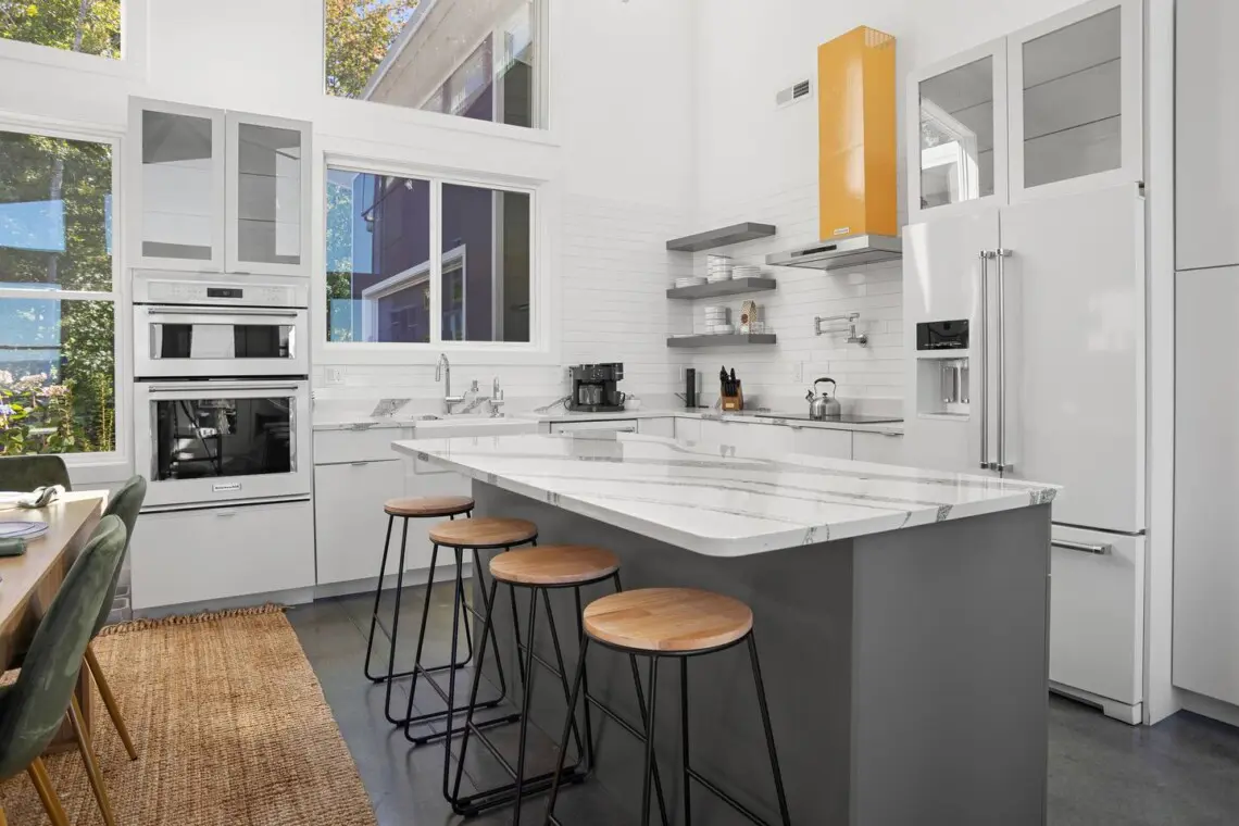 * CASUAL BAR SEATING: The kitchen bar comfortably seats four, ideal for quick breakfasts or chatting with the chef.