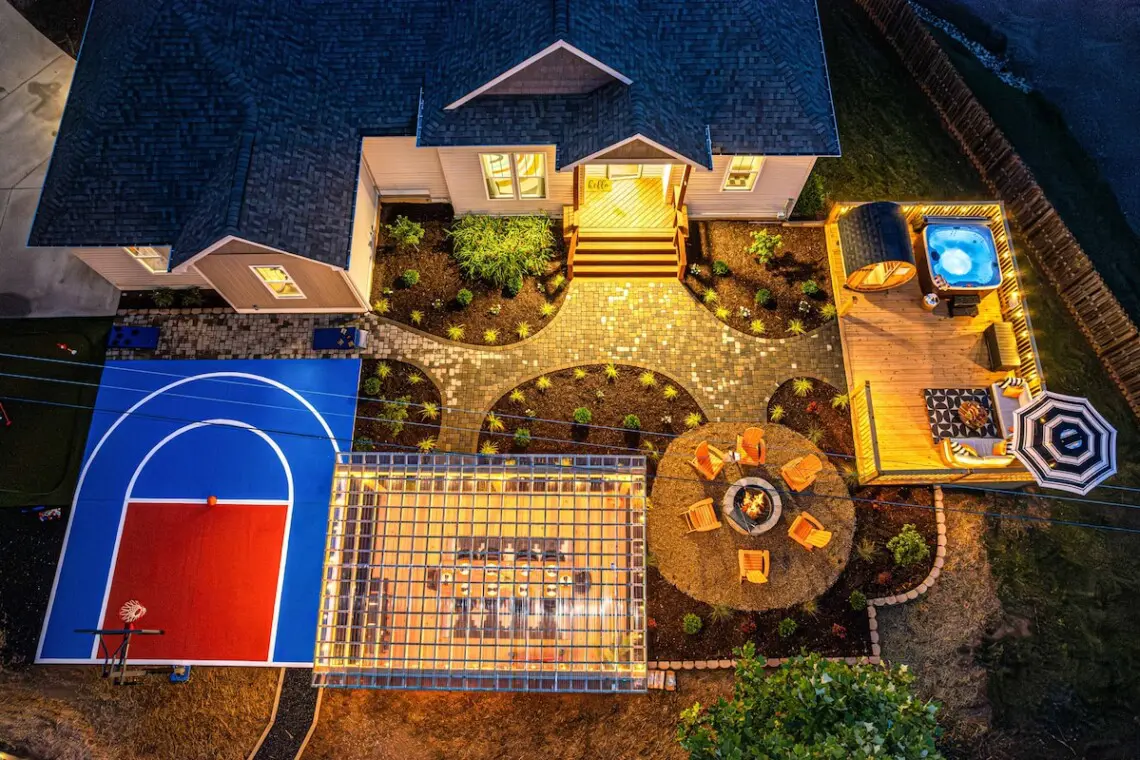 Guests can soak in panoramic sunset views from the spacious outdoor dining area, complete with a half-court basketball setup, mini golf course, and a one-of-a-kind geodome for relaxing or stargazing and spacious yard. You’re just a short drive from Asheville’s top restaurants, the iconic Biltmore Estate (20 minutes), and the creative River Arts District (15 minutes), with local hiking trails only 30 minutes away. It’s a serene, activity-rich base for exploring everything Asheville has to offer.