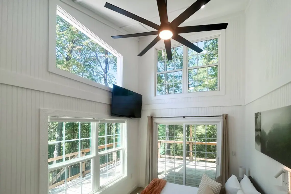 – Second: Queen-size cooling memory foam mattress, en-suite bathroom, deck access, Roku Smart TV