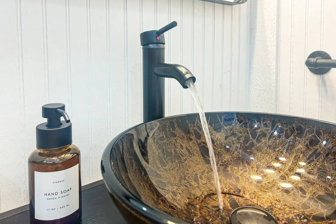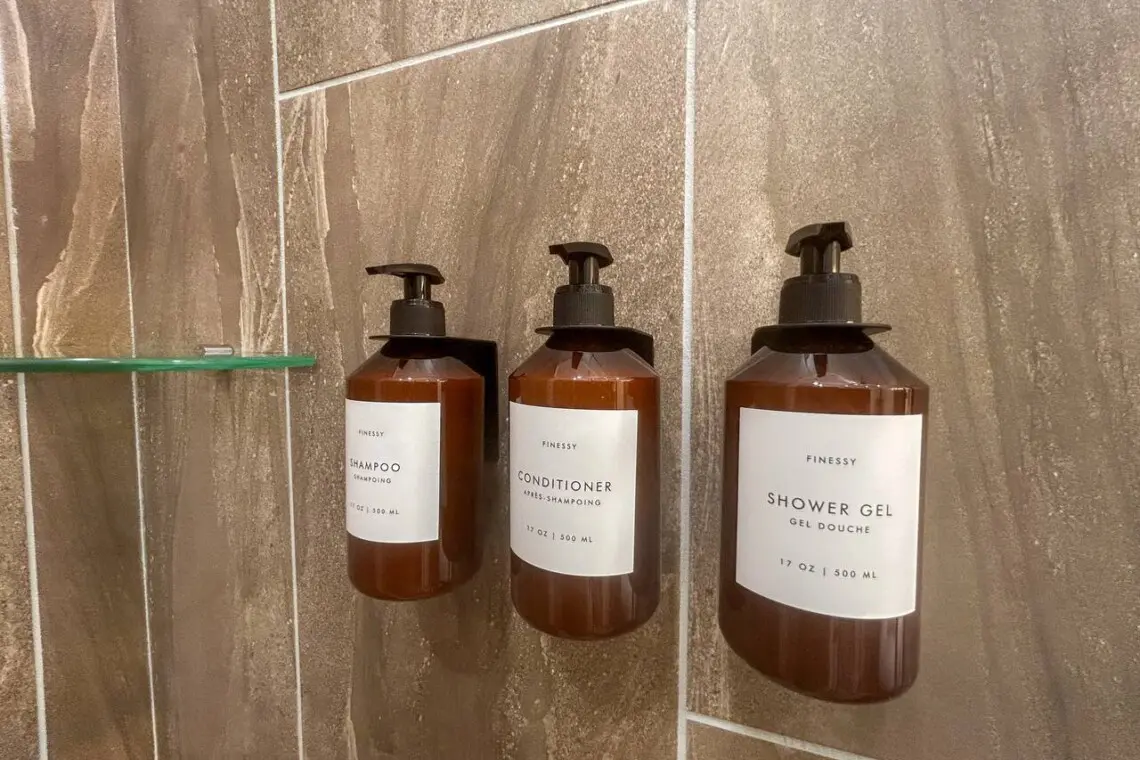 – Ceramic tiles, bowl sinks, vanities with blow dryers, towels, toiletries