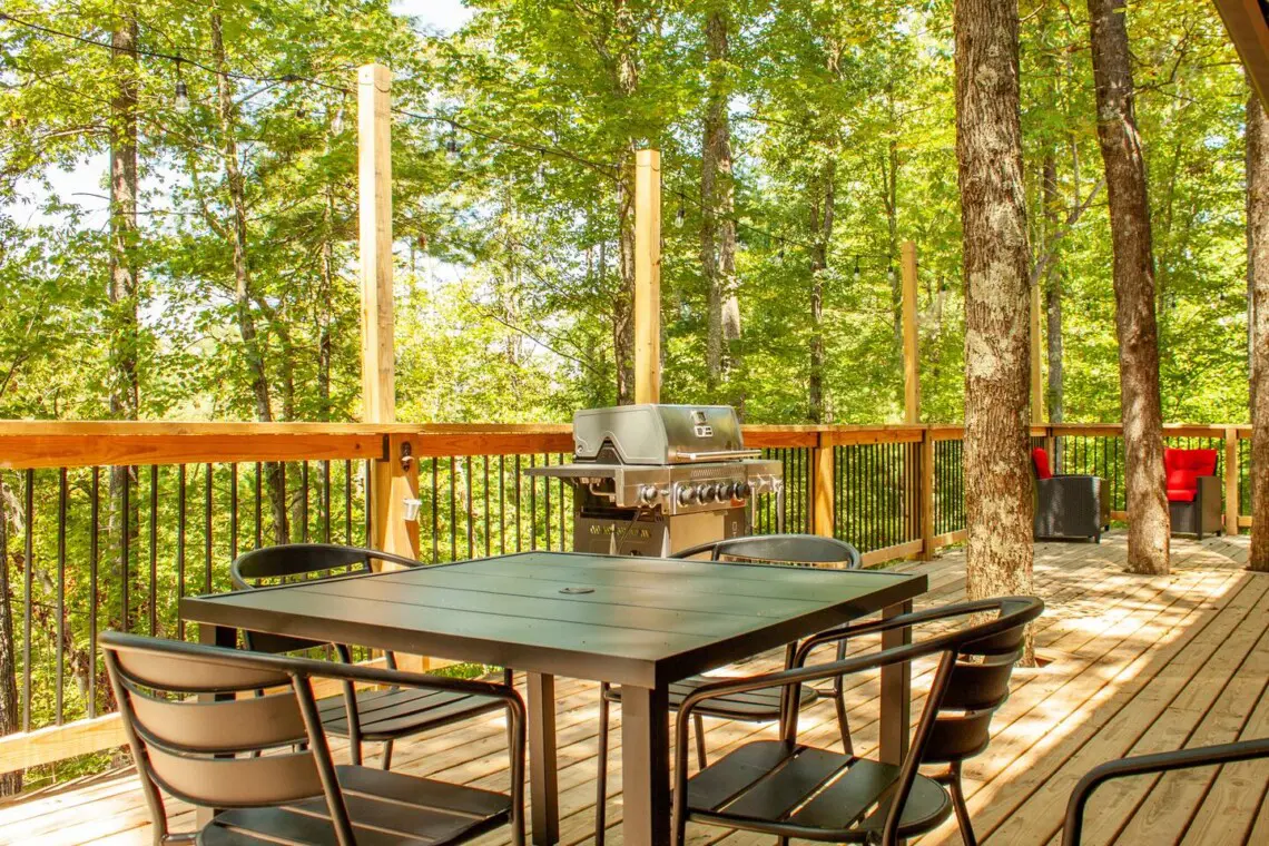 – Wraparound deck with bench on front deck, rear dining area, BBQ grill, cushy loungers, and Adirondack chairs