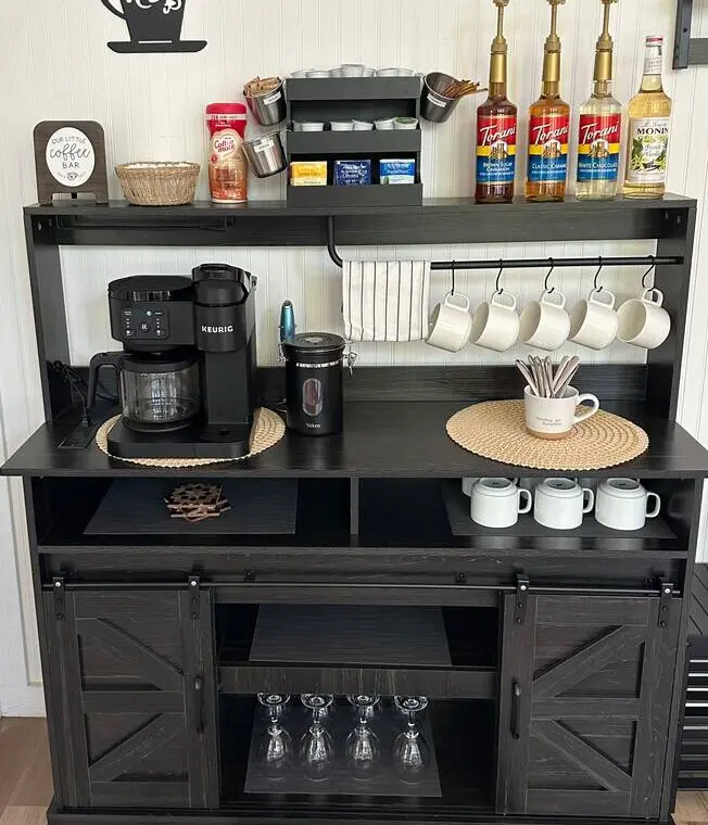 – Coffee bar with Keurig, coffee/tea, filters, stevia, sugar, honey sticks, creamer