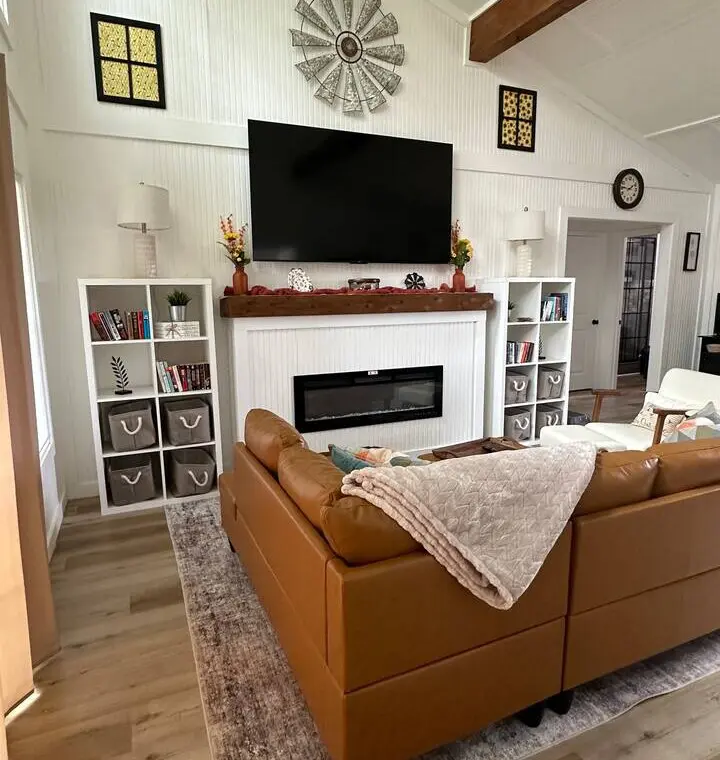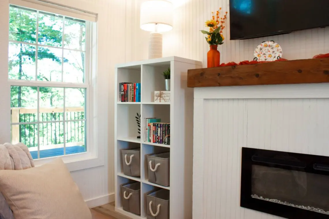 – Warm wood walls, rustic beams, electric fireplace with remote