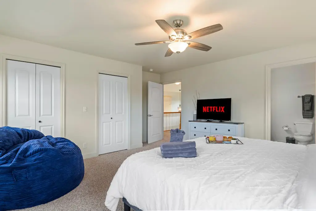 A spacious master suite with ensuite bathroom designed for rest, featuring a king bed with plush bedding and blackout curtains for a great night’s sleep. Perfect for couples or guests who value extra privacy and comfort. This room also features a ceiling fan, and convenient charging stations.