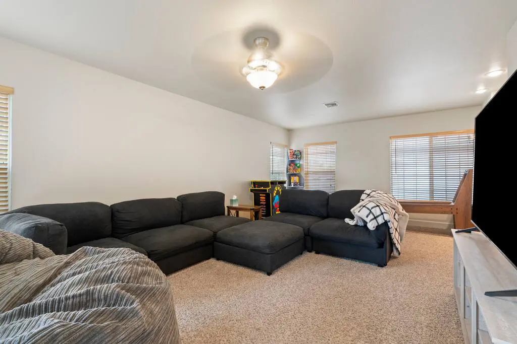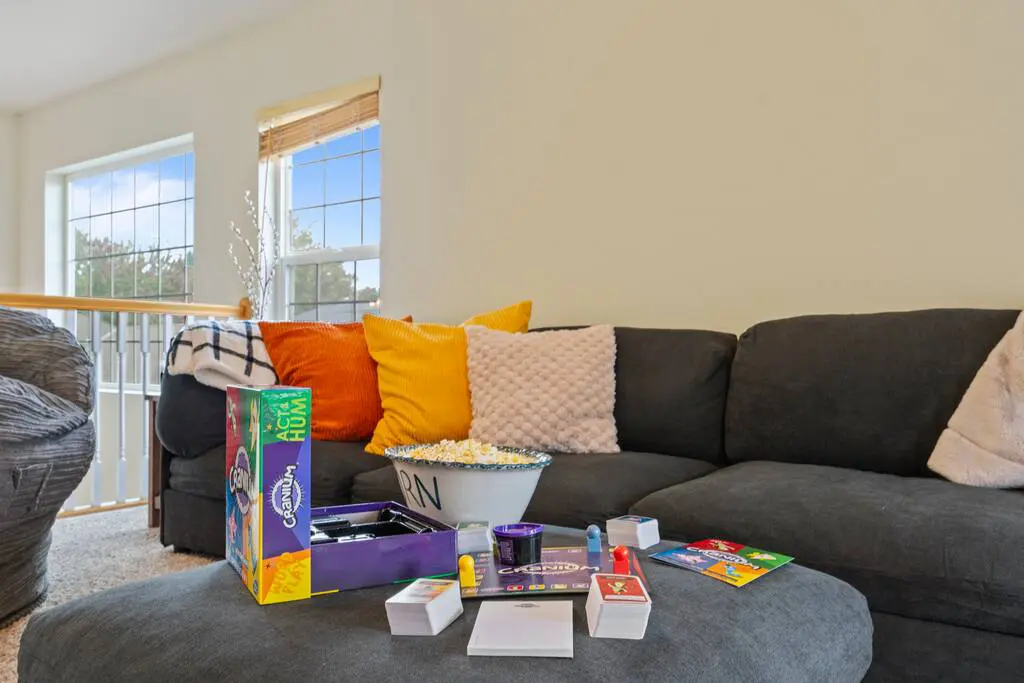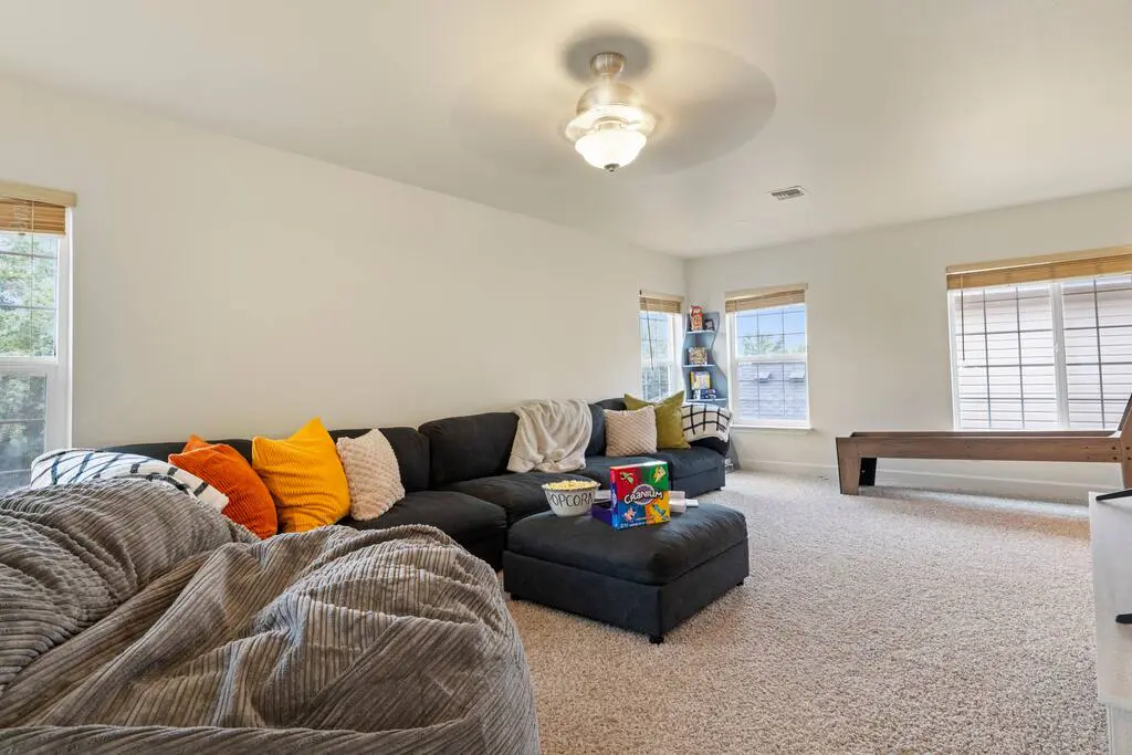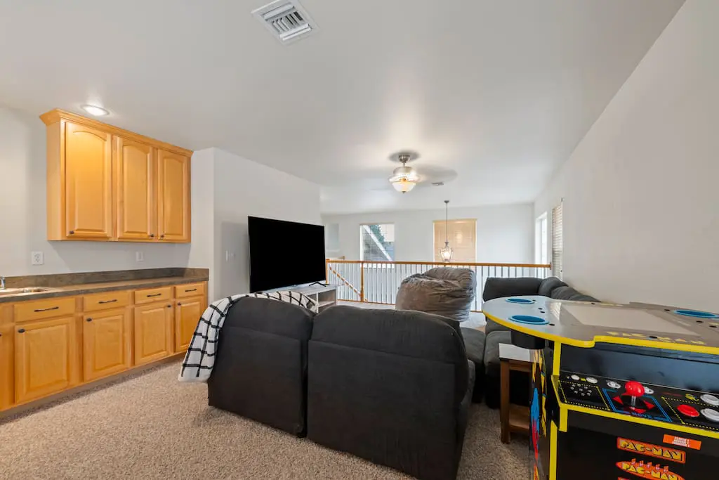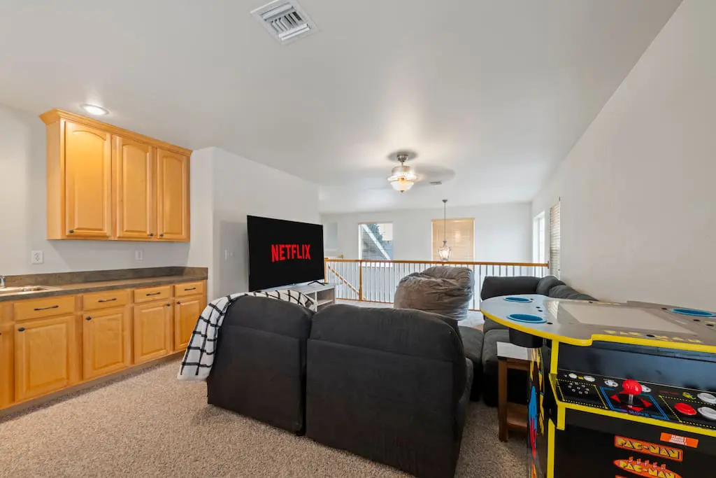 Bonus game/movie room with Skee Ball, 70” Smart TV, and cozy extras like beanbag beds