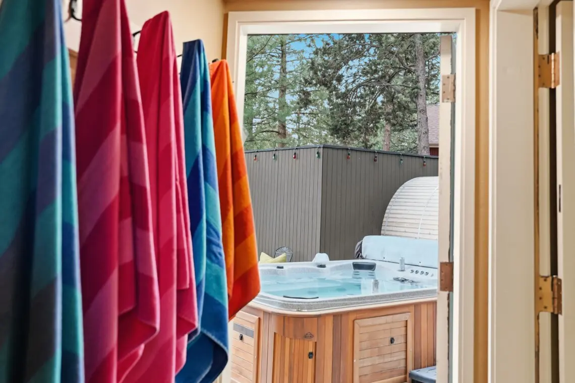 Relax in privacy among tall pines in the spacious hot tub for a peaceful retreat.