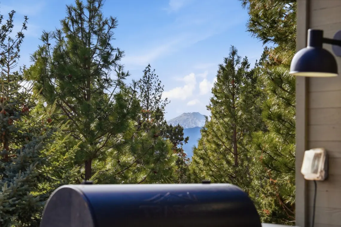 Fire up the Traeger BBQ to elevate your outdoor dining experience while overlooking the trees; mountain view and city.